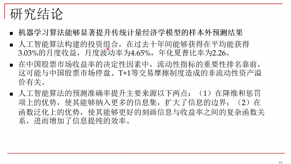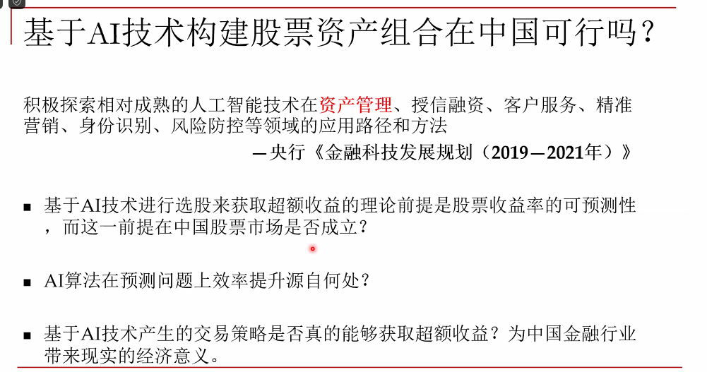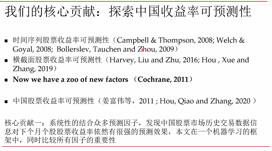 5月14日,鑫苑宏观金融与资产定价workshop如期举行。本期主讲人为鑫苑房地产金融科技研究中心博士后吴辉航。吴博士为大家展示了他最近的工作论文《机器学习视角下中国股票资产收益率可预测性研究》。这篇论文基于1997年到2019年中国股票市场因子数据库,结合十余种机器学习主流算法,回答了中国股票收益率是否可被预测的问题。论文还进一步基于机器学习算法预测结果,构建了中国股票市场可投资的资产组合,发现机器学习算法能够显著的提升资产配置效率,获取超额收益。该论文曾在第二届中国金融学术与政策论坛、中国金融科技学术年会进行展示,并获得第二届中国金融学术与政策论坛优秀论文奖。(以下为演讲PPT节选)吴辉航博士简介:吴辉航,清华大学五道口金融学院博士后,2018年获上海财经大学经济学博士学位,主要研究领域为:资产定价,机器学习和金融科技。曾在Small Business Economics、 International Review of Finance、 Emerging Markets Finance and Trade、《经济研究》、《数量经济技术经济研究》等重要期刊发表学术论文十余篇。 原文链接:https://xyfintech.pbcsf.tsinghua.edu.cn/uploadfile/2020/0508/20200508025828464.pdf